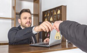 Image of a receptionist at his desk giving the key to a client. Selective focus on the key.